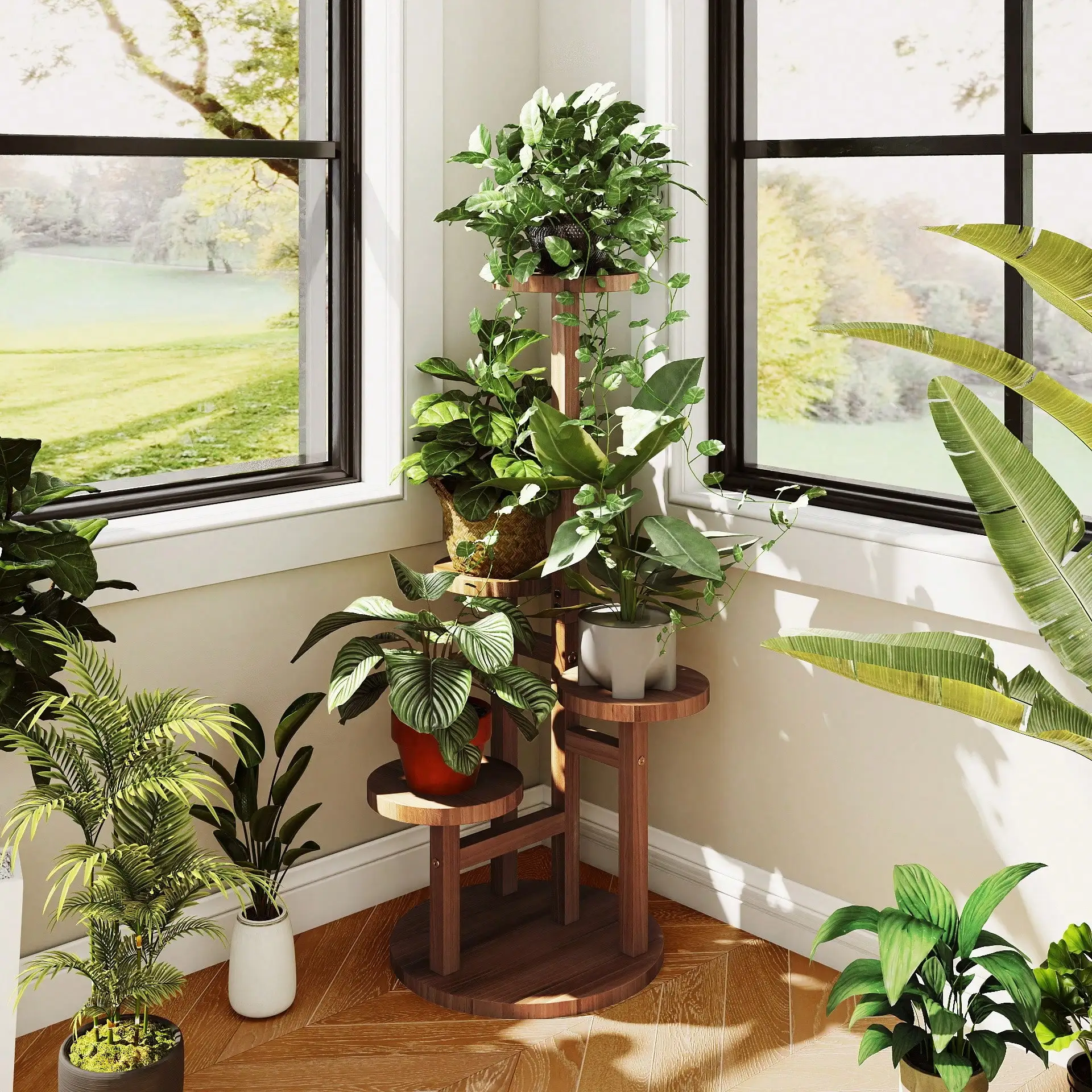 Showcase your plants beautifully with this 4-tier wooden plant stand, designed to add height, structure, and warmth to any space. Featuring a round, multi-level design, this corner plant shelf allows you to display multiple plants while maximizing floor space.