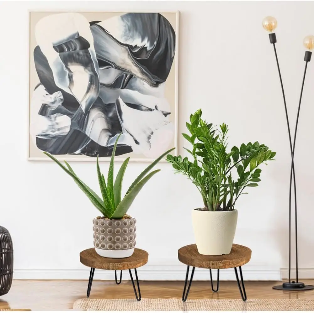 Modern wooden plant stand with a natural wood top and metal legs—perfect for elevating indoor plant displays.